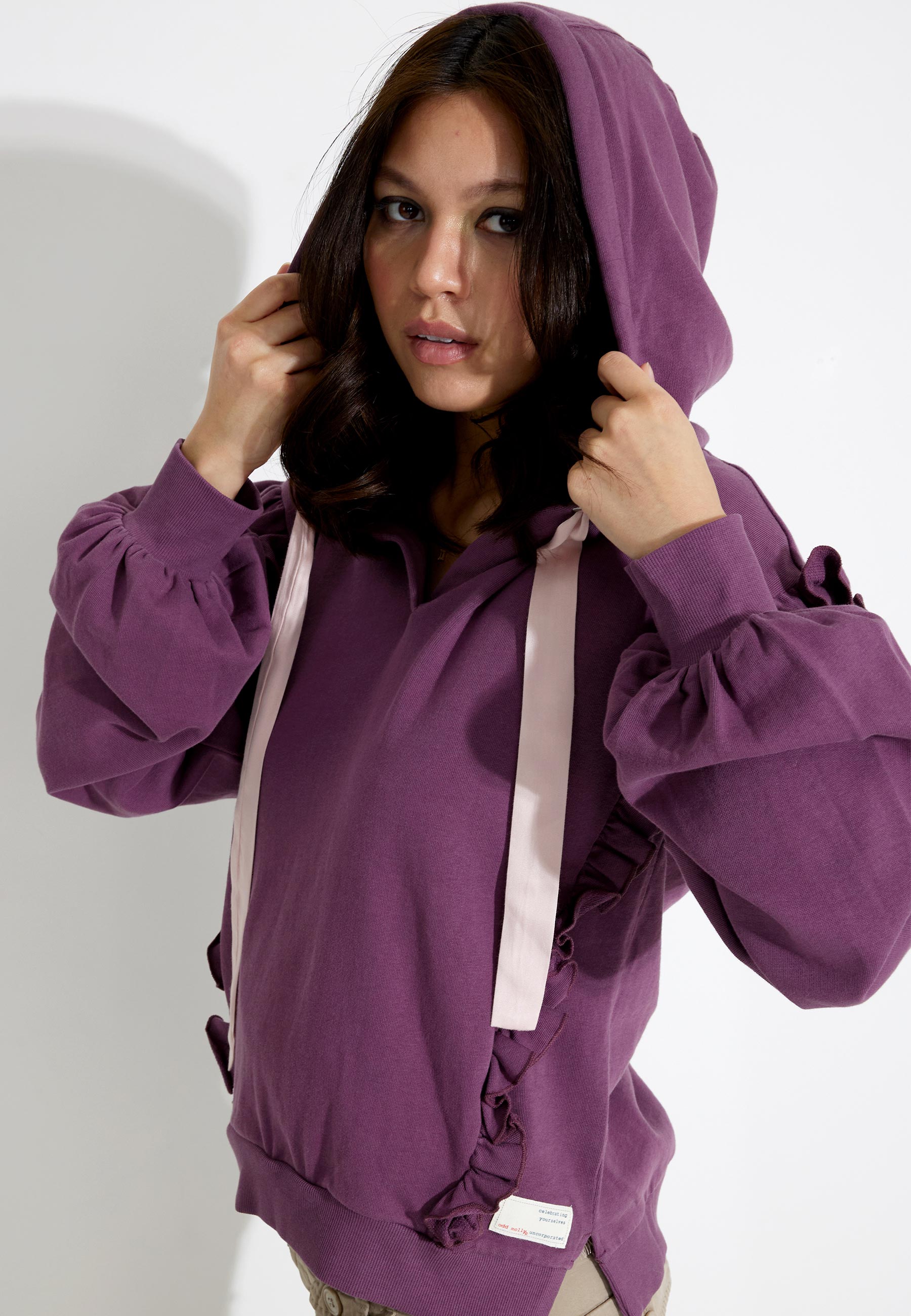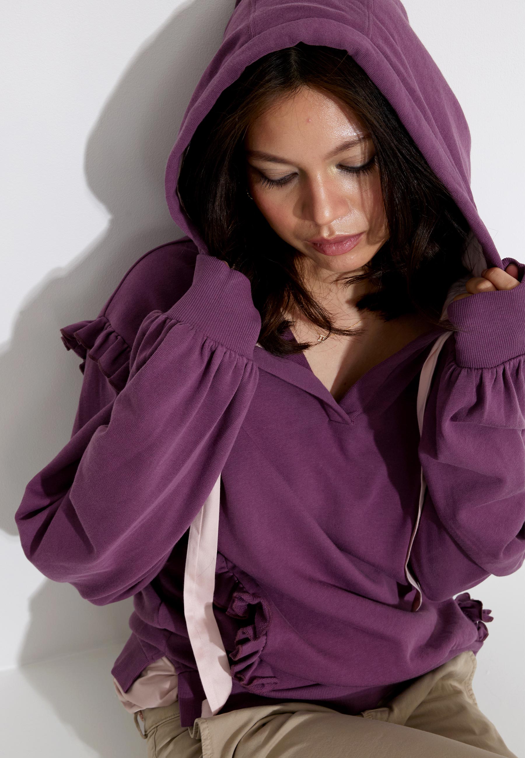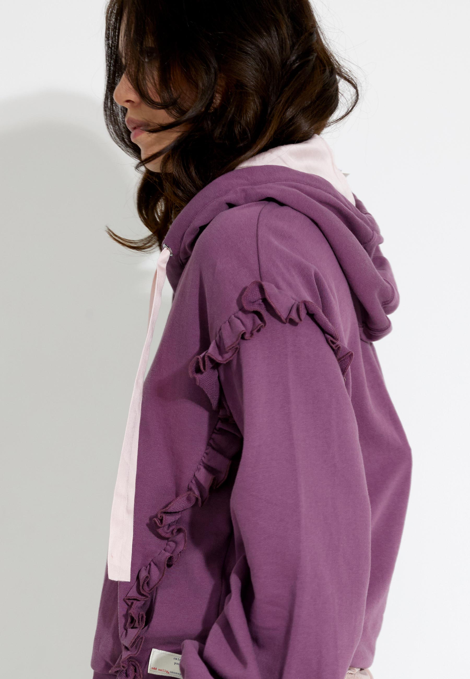Hoodie von Odd Molly mit verkürzter Passform, Kapuze und dekorativem Rüschendetail. Vielseitig für entspannte Anlässe zu Hause oder für Aktivitäten wie Fitnessstudio und Spazierengehen.