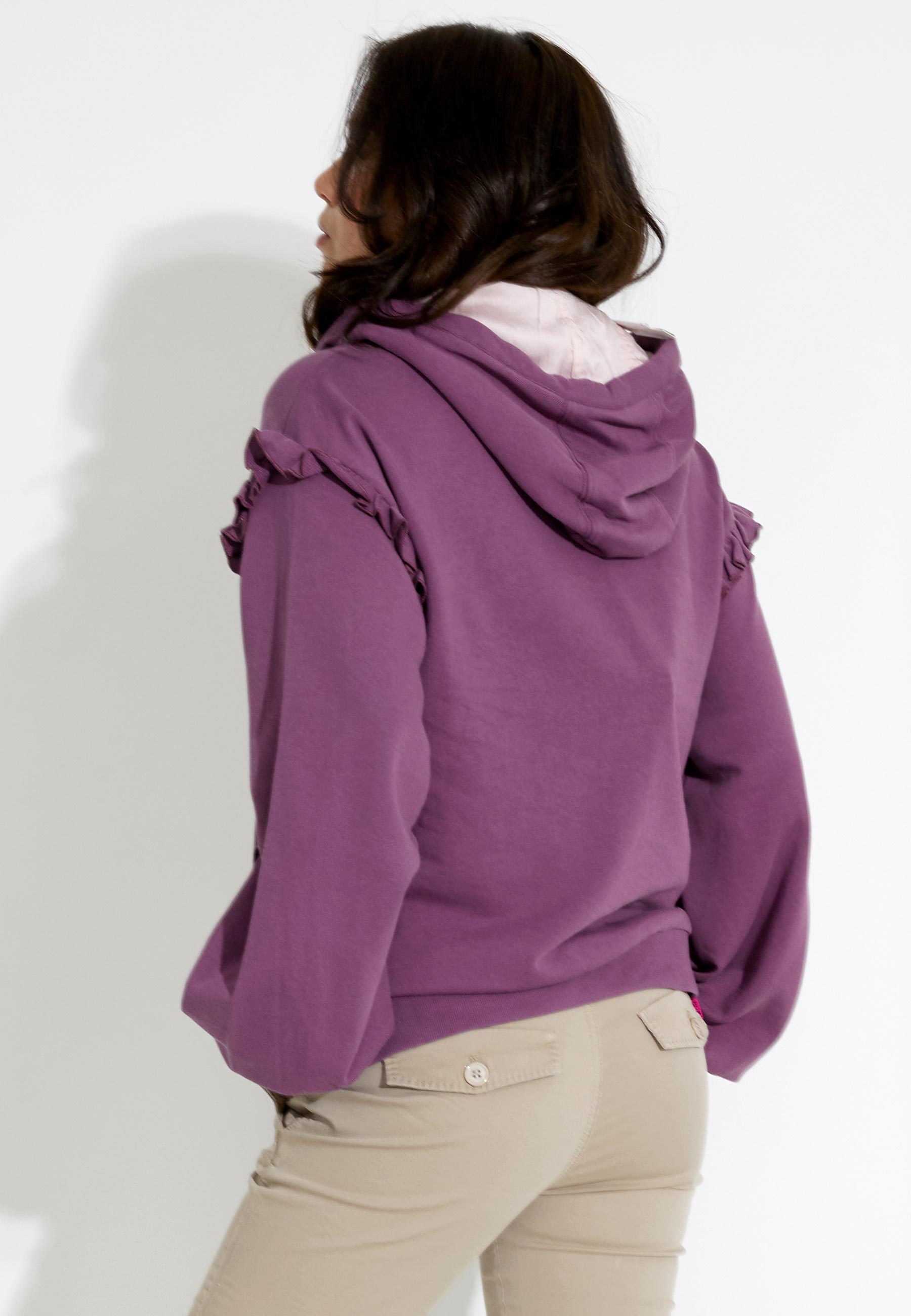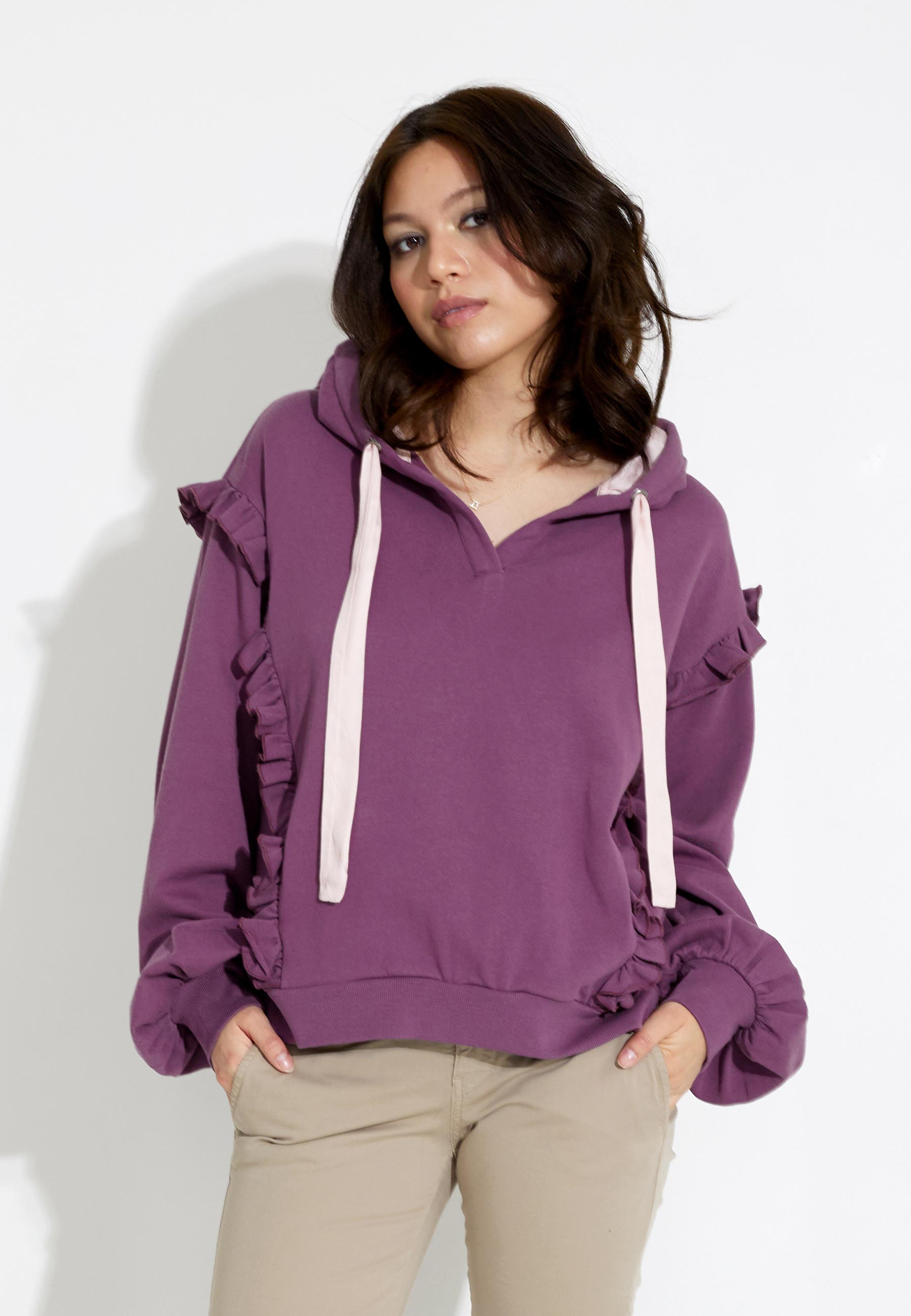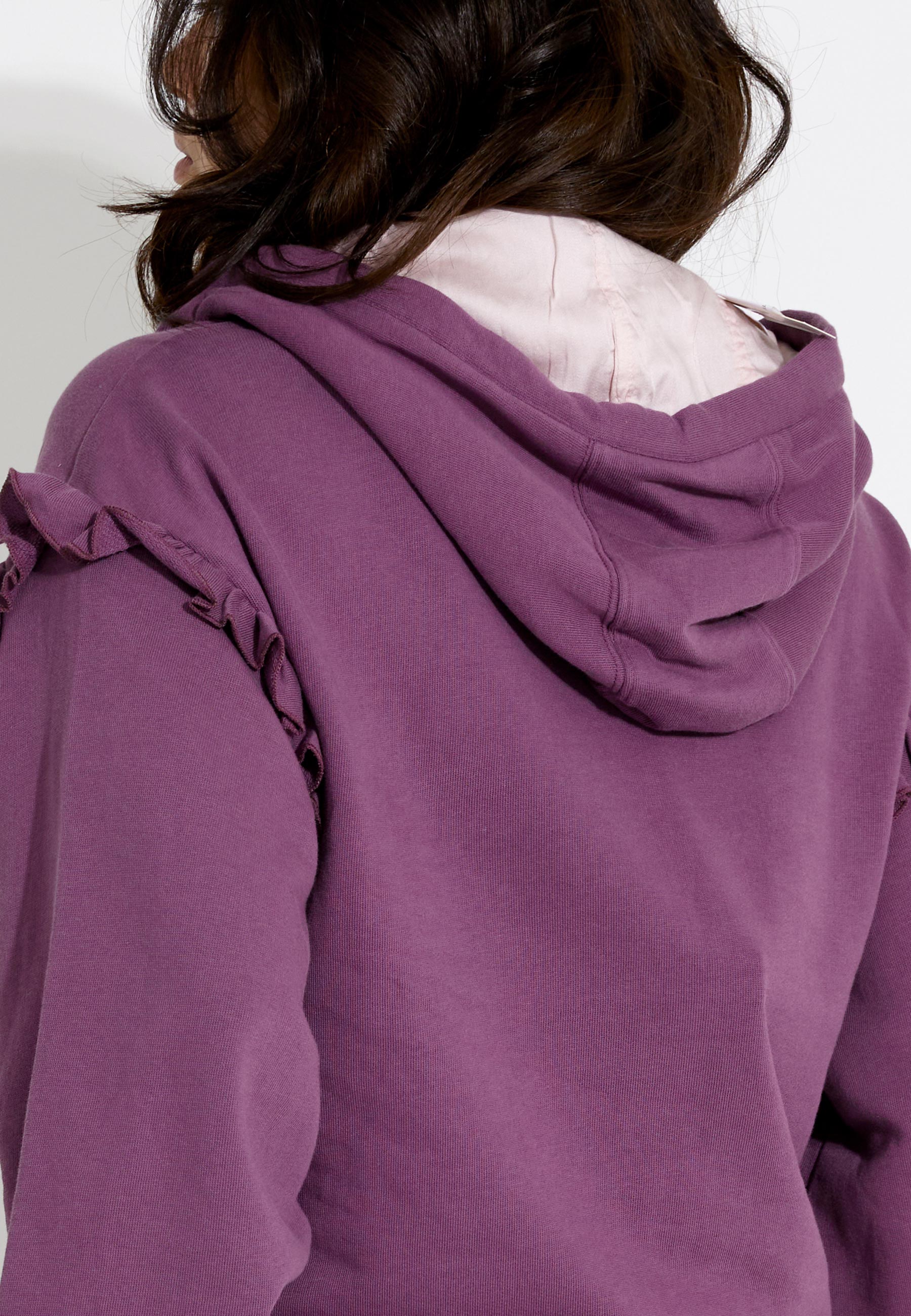 Hoodie von Odd Molly mit verkürzter Passform, Kapuze und dekorativem Rüschendetail. Vielseitig für entspannte Anlässe zu Hause oder für Aktivitäten wie Fitnessstudio und Spazierengehen.