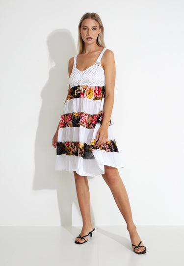 Erleben Sie Freude mit diesem Kleid mit Blumenmuster. Gehäkelte Brust- und Schulterträger sorgen für einen charmanten Stil, während die einfache Schleife vorne und die luftige Passform es perfekt für jeden Anlass machen. Dehnbarer Gummizug auf der Rückseite sorgt für zusätzlichen Komfort.