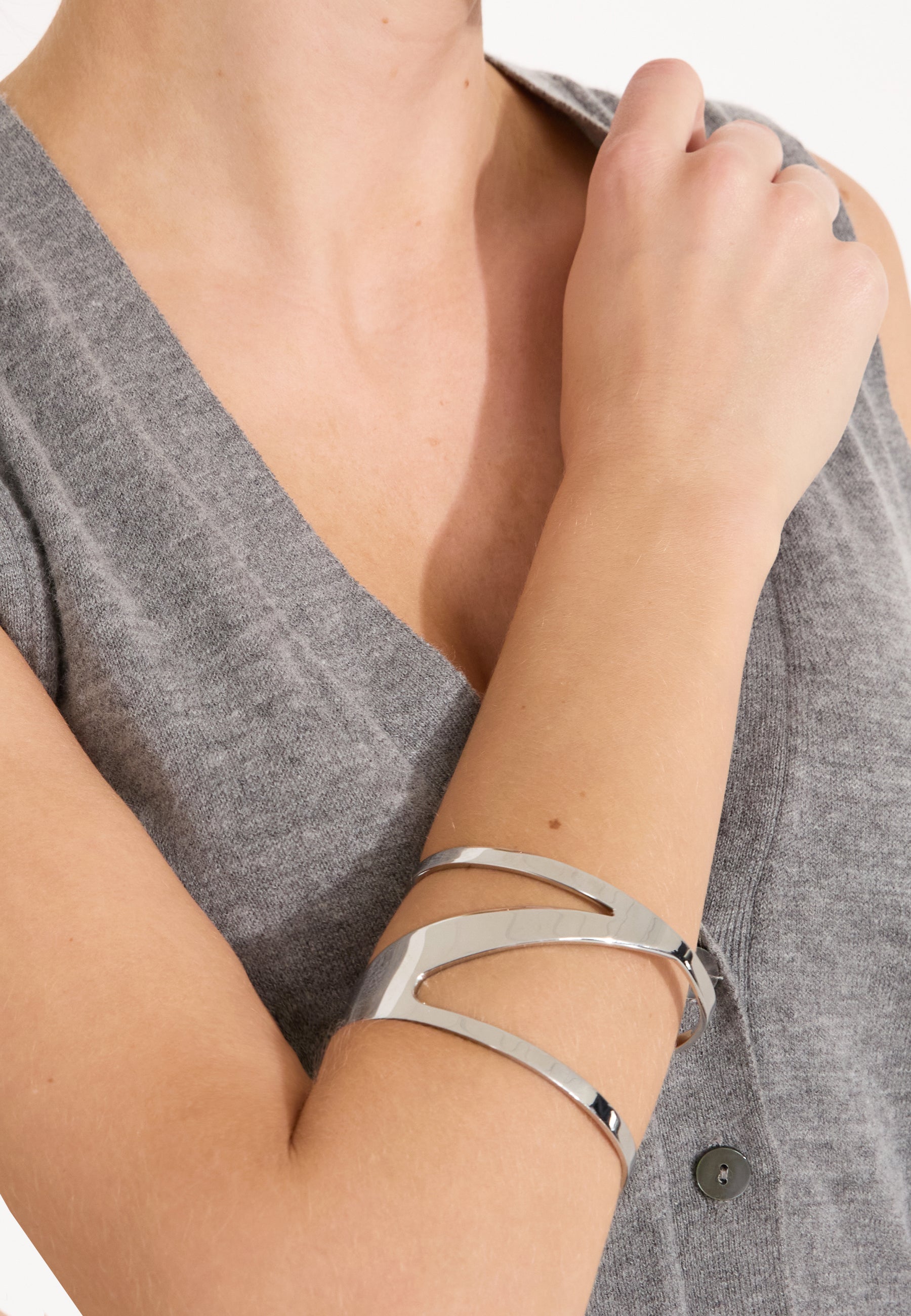 Silbernes Armreif-Manschettenarmband von ELIXA. Dieses Armband hat ein modernes und abgerundetes Design, das Ihr Handgelenk auf elegante Weise umrahmt.