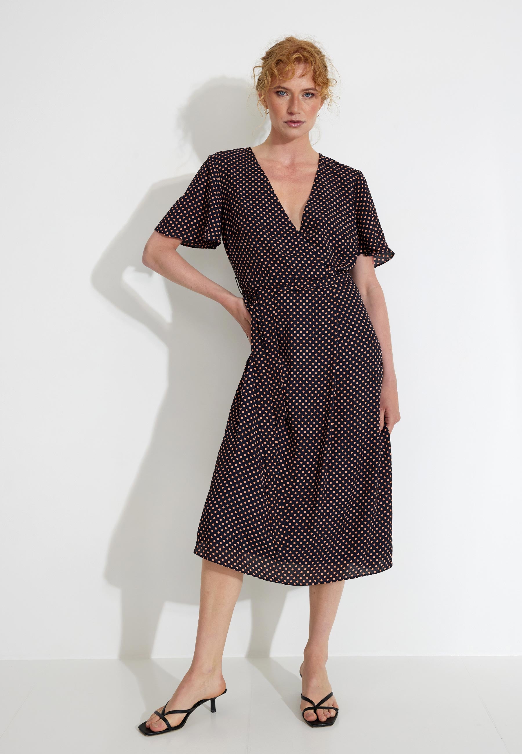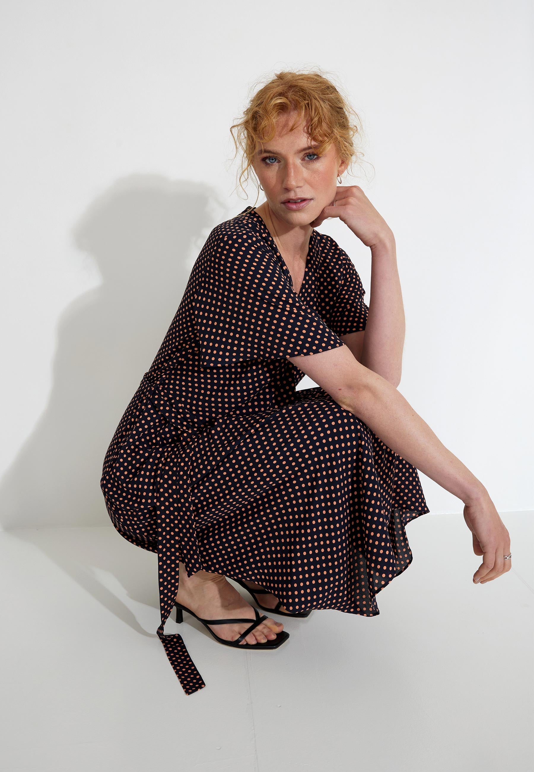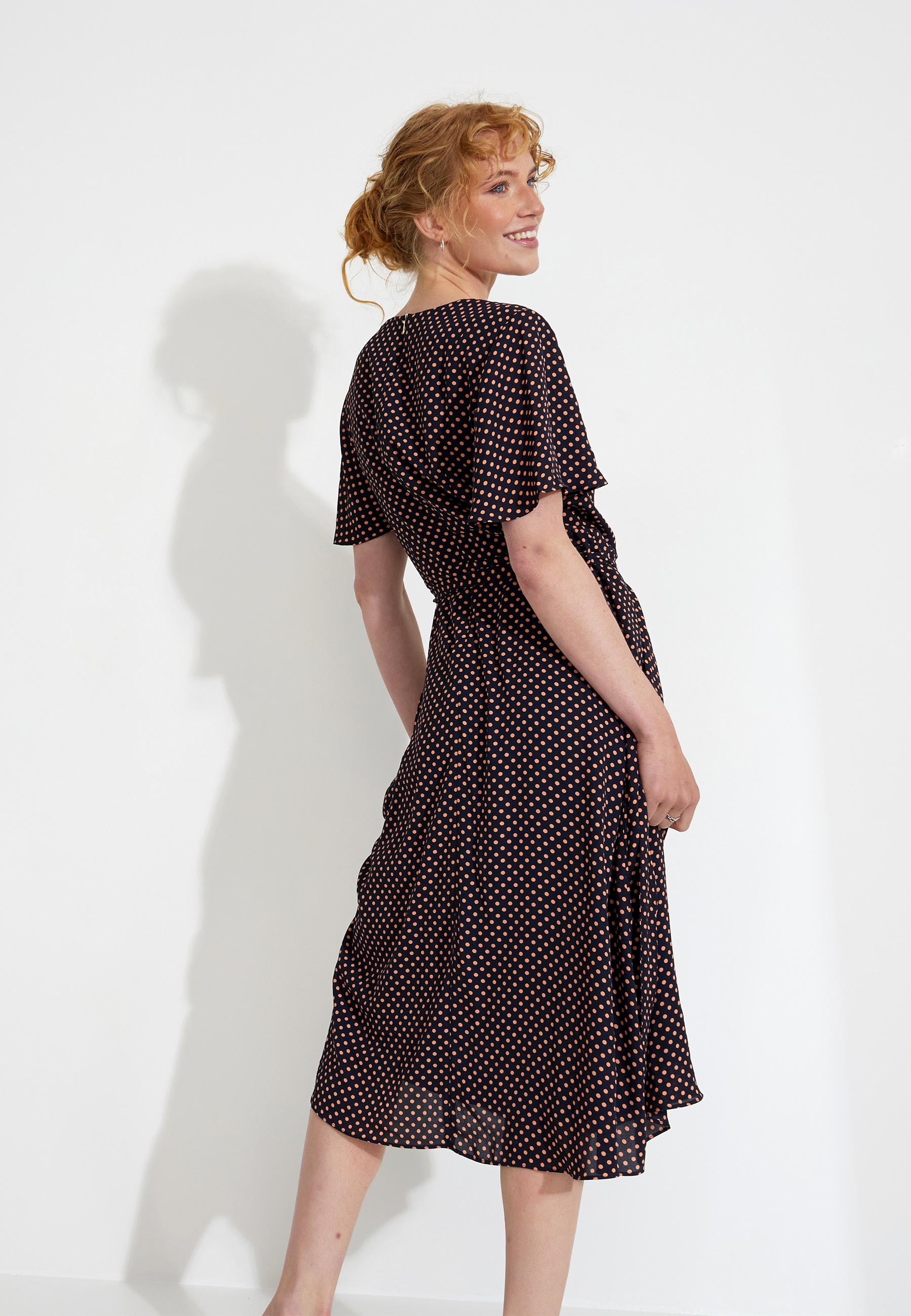 Omlottklänning från ESPRIT. Prickigt mönster och har ett band som kan knytas åt i midjan.