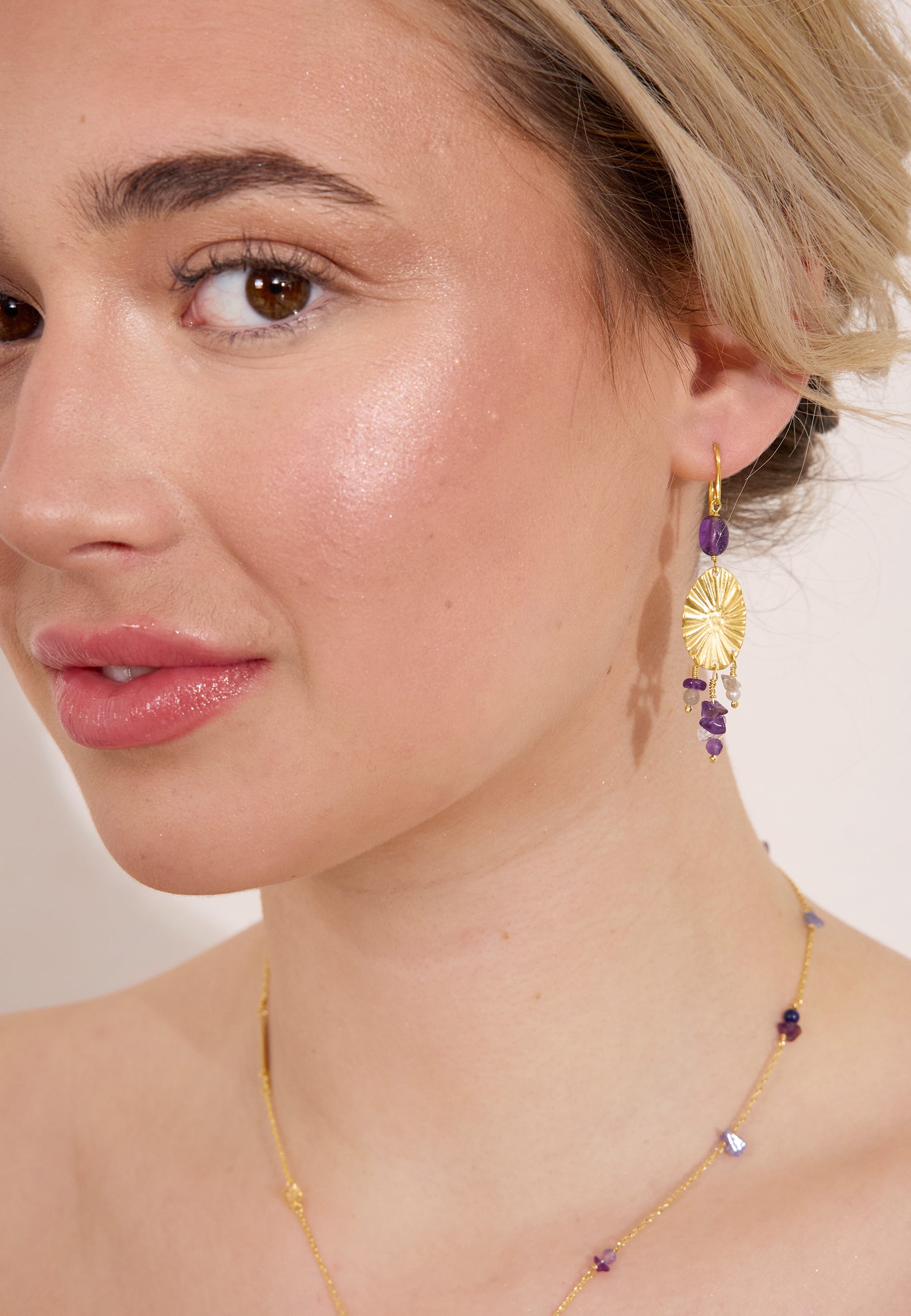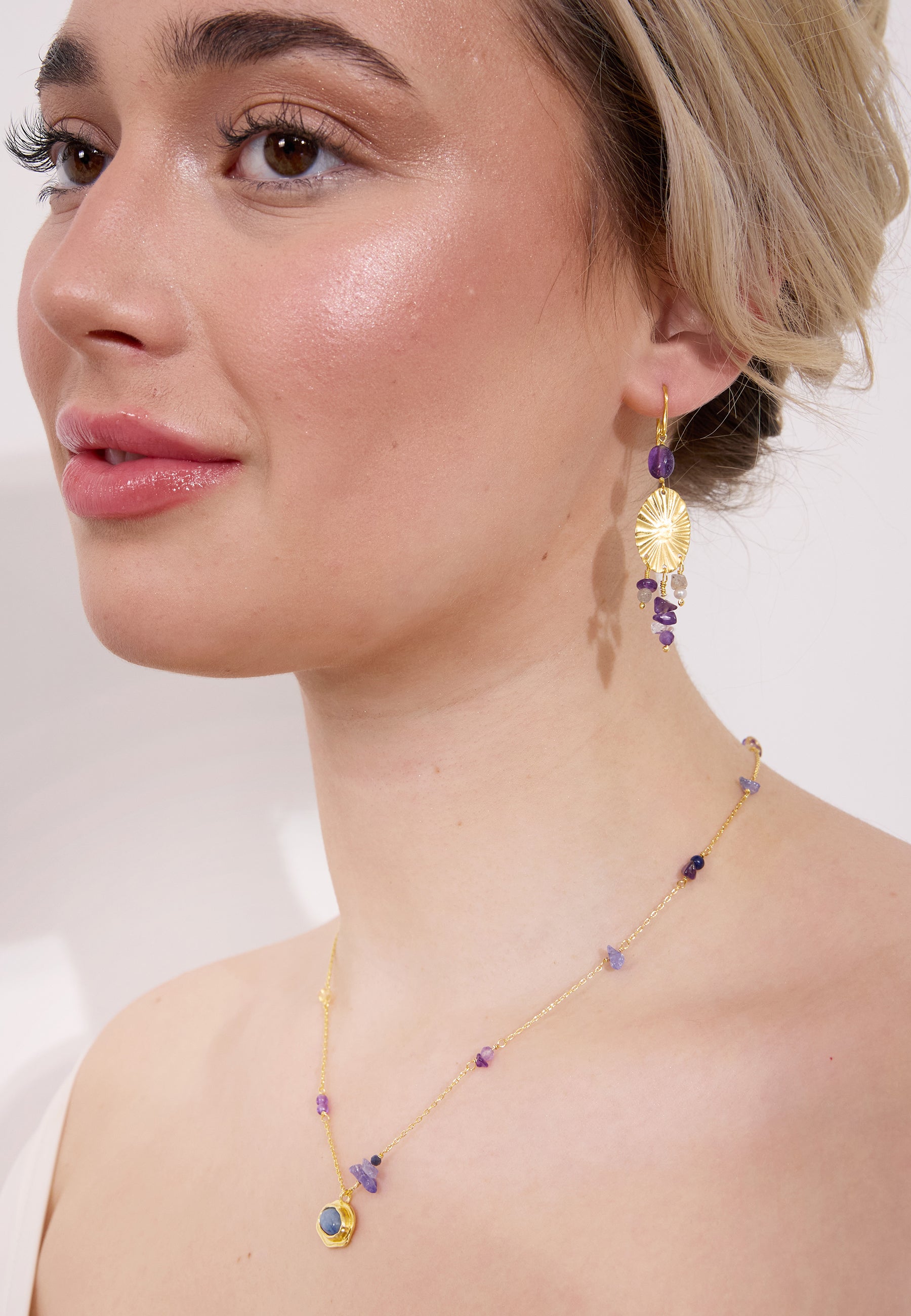 Kvalité & Material 18 karat guldpläterat återvunnet sterling silver 925 med ametist, labradorit, sötvattenspärla och bergkristall.